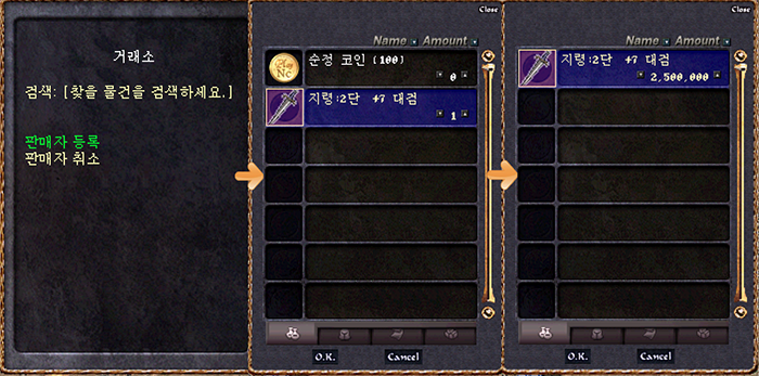 거래소를 클릭하면 검색, 판매자 등록 , 판매자 취소가 뜹니다 .
